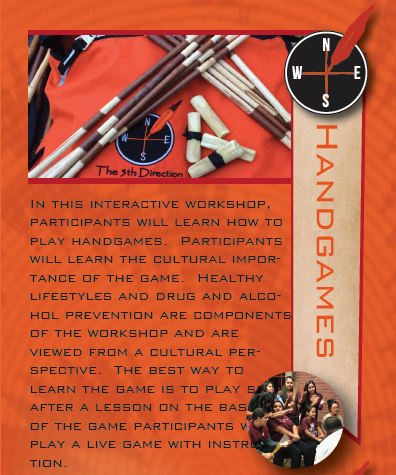 Handgames, or stickgames are a traditional game played by many tribes throughout Native America. The game is played with humor, spirituality and power beyond contemporary understanding. The importance of this game traditionally far exceeds the knowledge taught in western society. This demonstration will teach Native youth about traditions and the cultural aspects as well as spirituality of the game, which is sometimes forgotten today. The game also teaches young people to avoid negativity and to keep a positive outlook and clean mind, body and spirit to achieve success for your people. Subjects such as culture, abuse of drugs and alcohol as well as one another is taught and youth learn that success in traditional culture must be achieved with purity and respect.